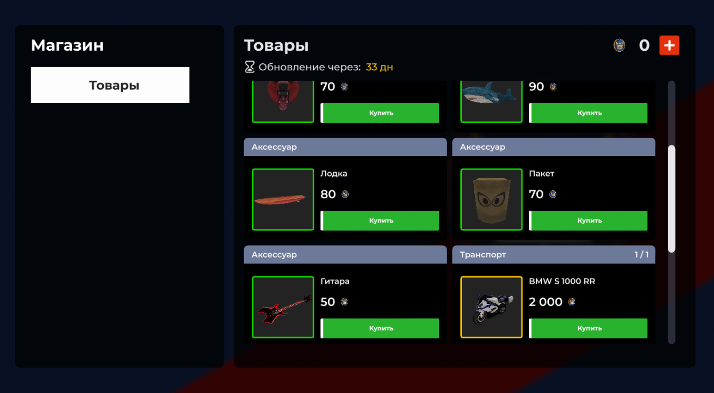 💡 Чтобы пользоваться мотоциклом BMW S 1000 BR и автомобилем Marussia B2 необходимо получить к ним доступ в магазине ГИБДД за свои кровные организационные жетоны. При выходе и повторном вступлении во фракцию транспорт будет всё так же доступен. Топовые тачки, пусть даже служебные, стоят затраченных усилий — ведь с вашим статусом в организации поспорить будет непросто!