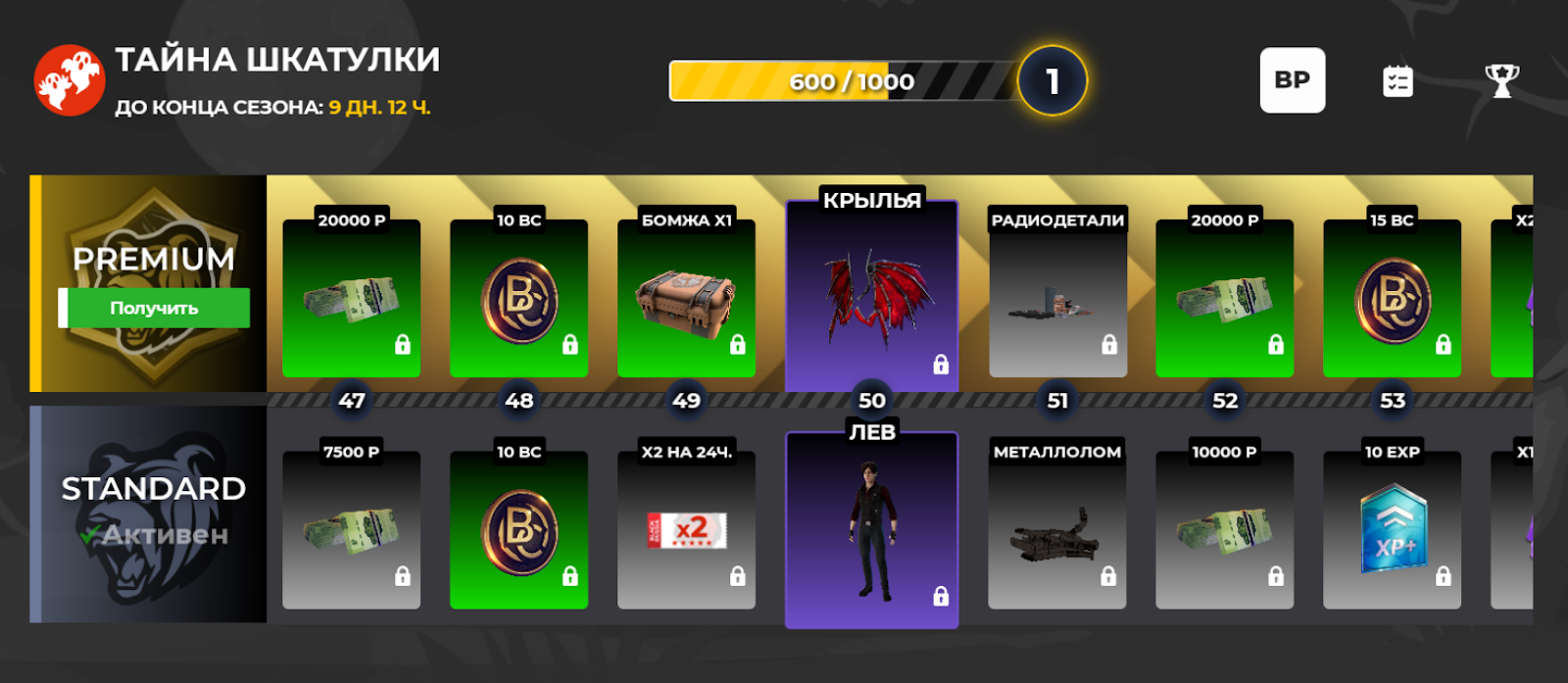 Двигайтесь от этапа к этапу, получая ВС, опыт аккаунта, опыт Black Pass, пыль, внутриигровые рубли, VIP-статус и кейсы. И, конечно, новые сезонные призы!