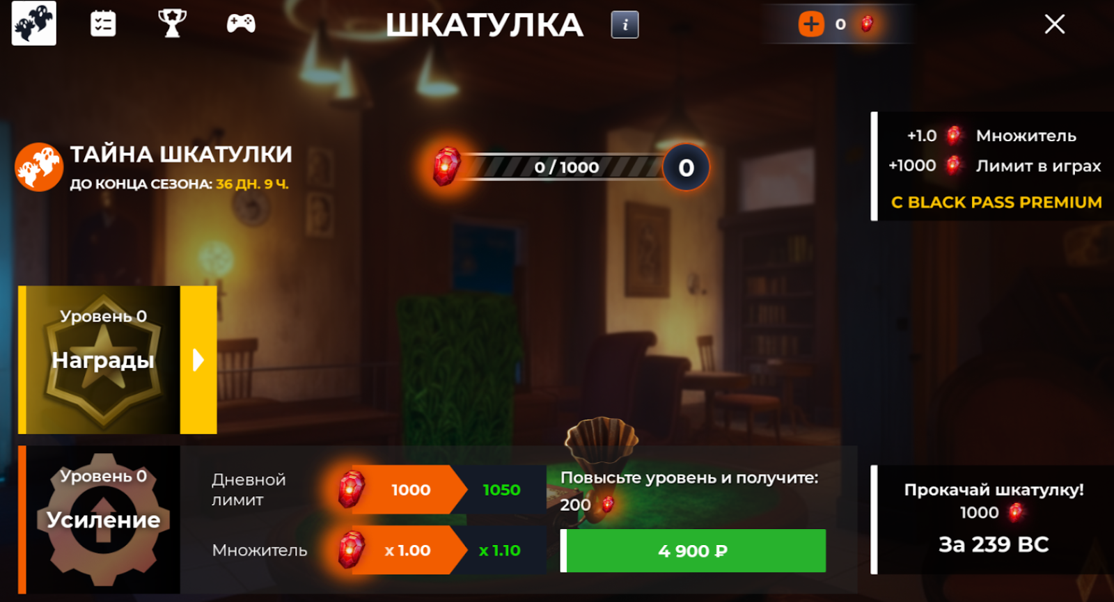 Вас ждут три леденящих кровь мини-игры, в которых вы сможете заработать багровые кристаллы для прокачки вашей Шкатулки. Чтобы в них поучаствовать, нажмите на иконку события Тайна Шкатулки в правом верхнем углу экрана, затем на иконку геймпада. Выберите игру, дождитесь остальных участников в очереди и вступайте в соревнования за рубли и сезонную валюту! Кайфуйте от участия и не бойтесь стать последним — все мини-игры беспроигрышные 🙌🏻