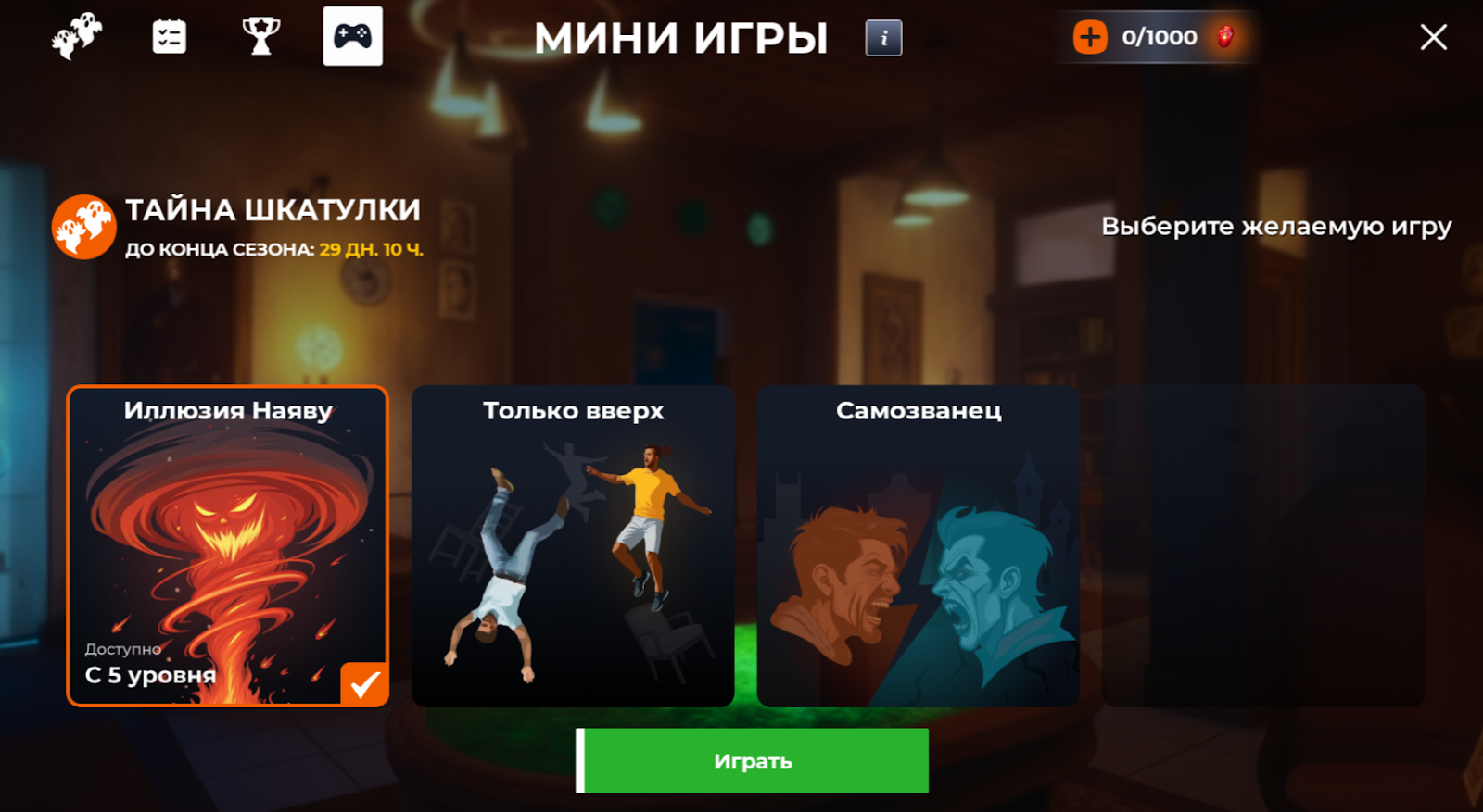 💡 Для доступа к игре нужны специальные билеты иллюзии. Их можно получить, проходя этапы Шкатулки, раз в день за 1 час онлайна и при покупке специального предложения Выгода каждый день в Новостном хабе.